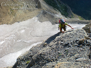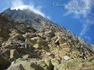 The face looked more moderate than I expected.  Quickly my nervousness gave way to excitement, but by the time we crossed the snowfield to the rock, Justin was doing all he could not to let the last night’s dinner come back up.  Despite feeling worked, he began climbing.  We had only been soloing for about 20 minutes when we spotted dark clouds moving in.  500 feet up the face; we weren’t yet at a point of total commitment.  Between the poor looking weather heading our way and Justin being sick, we decided it was best to leave this climb for another day.