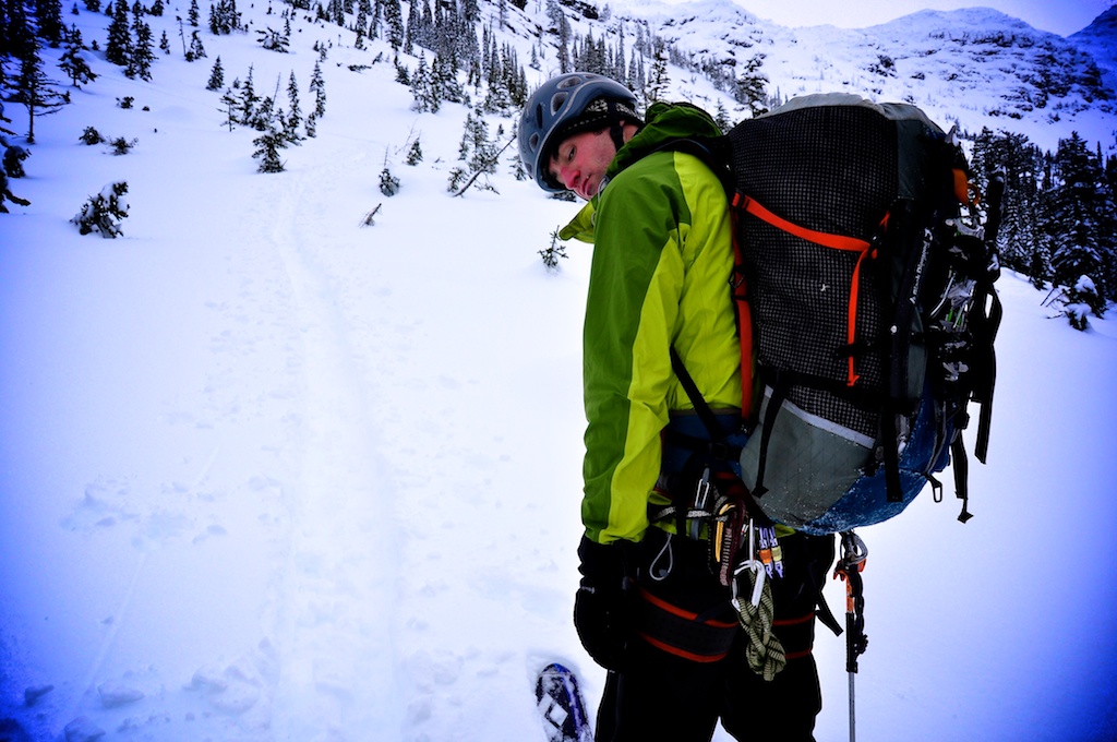 The weather window was small, but Ben and I decided to check it out anyways.  Our plan was to ski into Snyder Lake basin and climb “6 pack” to the summit of Mt. Edwards.  I had done the climb about 8 years ago and knew it would take us two days.  As we began our ski in, we quickly realized the area had receive a lot of new snow and that the idea of climbing on Edwards would be a bad one.  When we reached the lakes and our campsite, we could see signs of natural avalanches all throughout the basin.  Our hopes to climb Mt. Edwards were shut down, but we had a back up plan…brainstem wall.