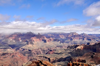 We woke to partly cloudy skies and went North. By the time we got to the Canyon, the clouds were high and visibility was good. We enjoyed an afternoon of sightseeing with the occasional snow shower. There were a few places left to stay and we found a nice cabin to stay in.