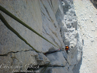 The next day we got on Sunspot. An amazing 7-pitch climb up one of the stunning dihedrals. It shares the start with Positive Vibrations then branches off left. It follows an amazing finger crack up the dihedral for four long pitches. Barely letting up at all, we stemmed and lie-backed our way up the beautiful line. Clouds were building over the valley so rather than continue to the true summit, we stopped at the top of the difficulties and began our descent. A single 70m line allowed us to rap another route and quickly reach the base.
