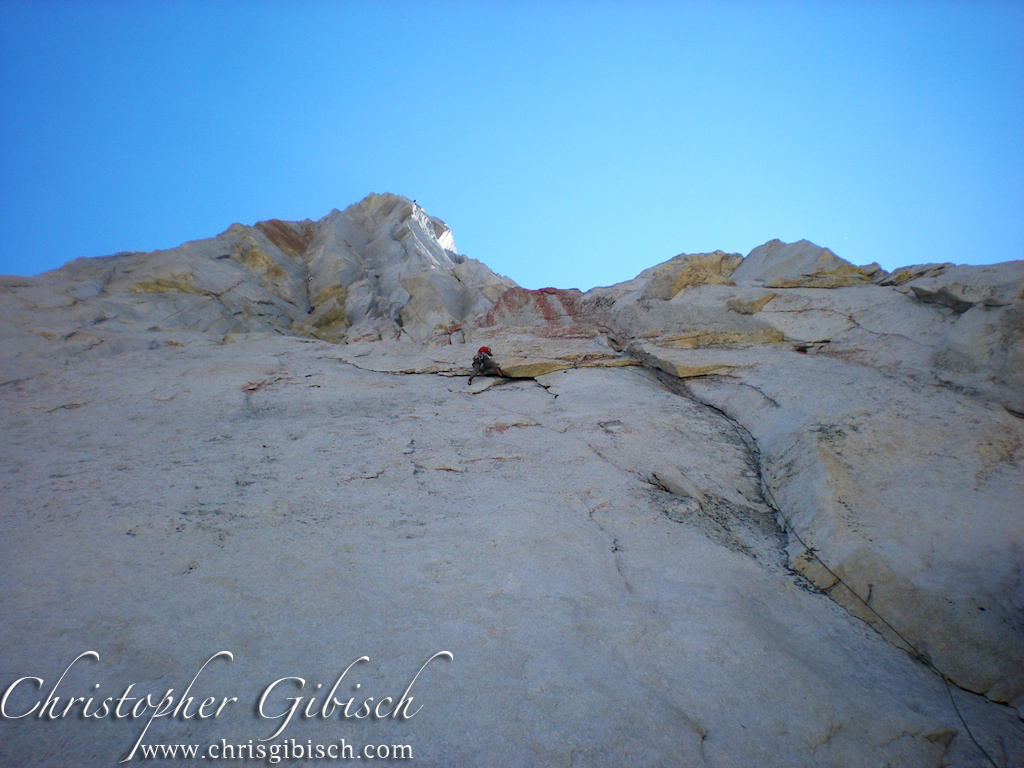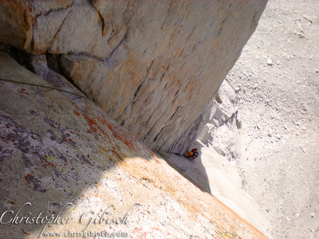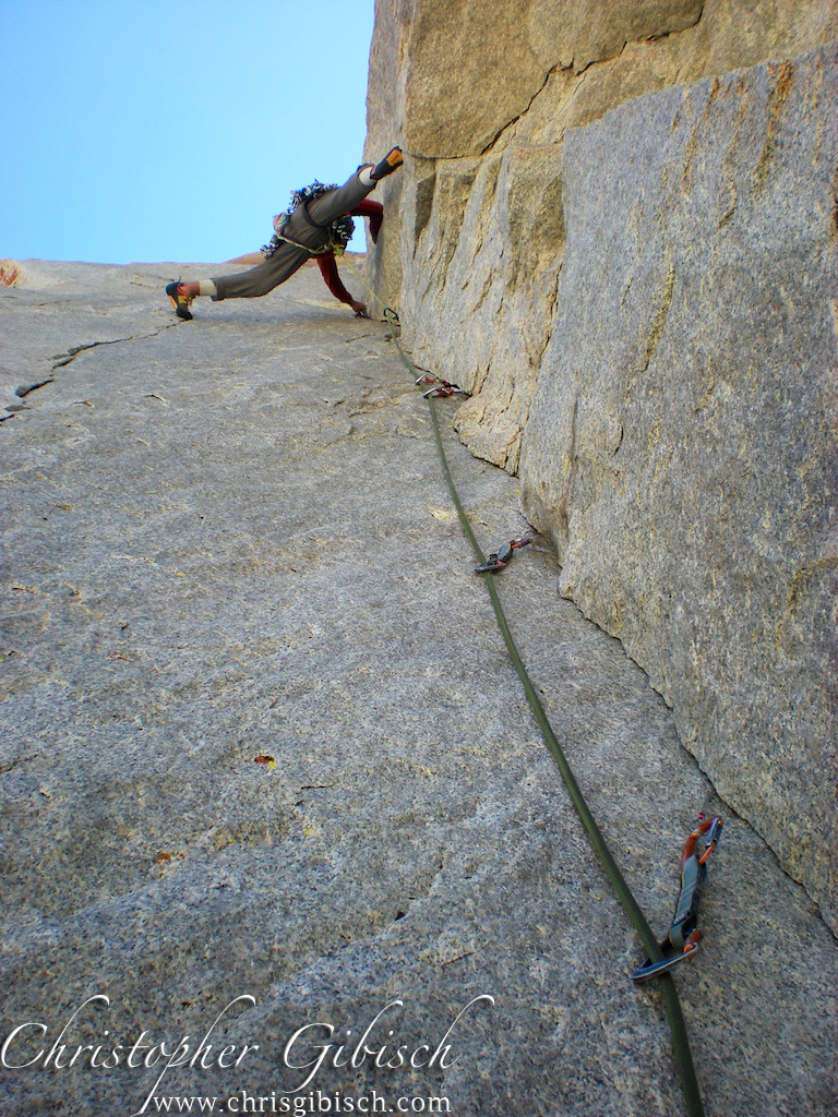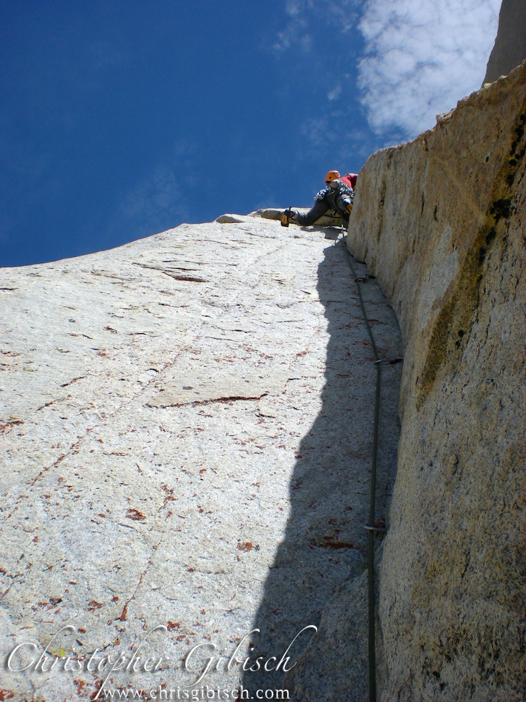 The next day we got on Sunspot. An amazing 7-pitch climb up one of the stunning dihedrals. It shares the start with Positive Vibrations then branches off left. It follows an amazing finger crack up the dihedral for four long pitches. Barely letting up at all, we stemmed and lie-backed our way up the beautiful line. Clouds were building over the valley so rather than continue to the true summit, we stopped at the top of the difficulties and began our descent. A single 70m line allowed us to rap another route and quickly reach the base.
